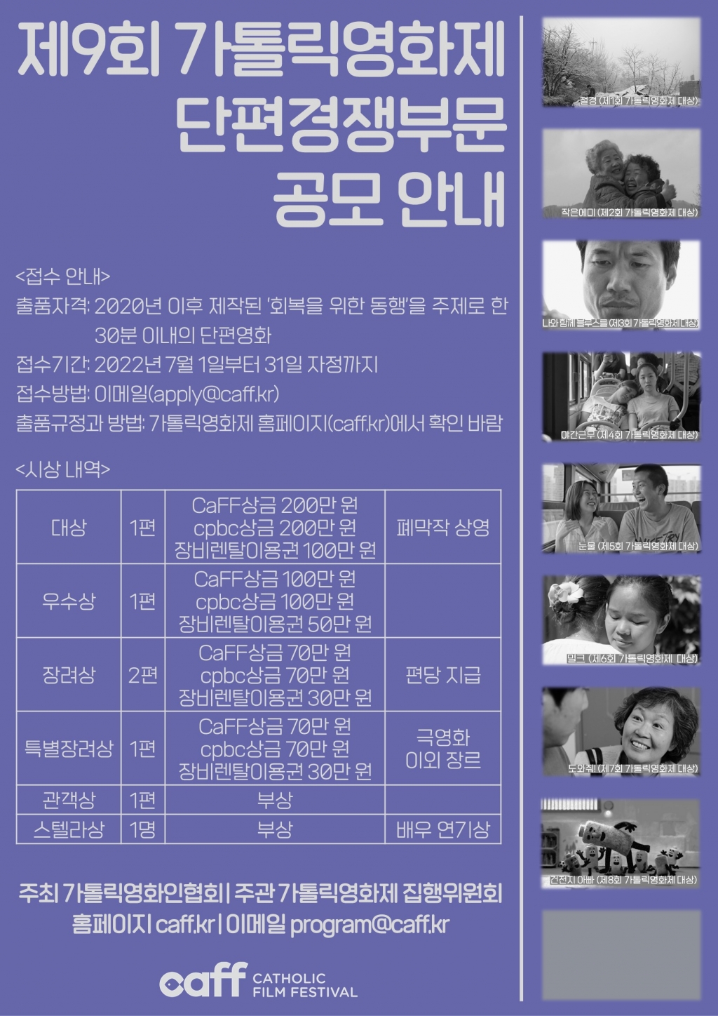 - 출품에 필요한 서류 및 규정 등 자세한 사항은 가톨릭영화제 홈페이지 caff.kr/competition 참고