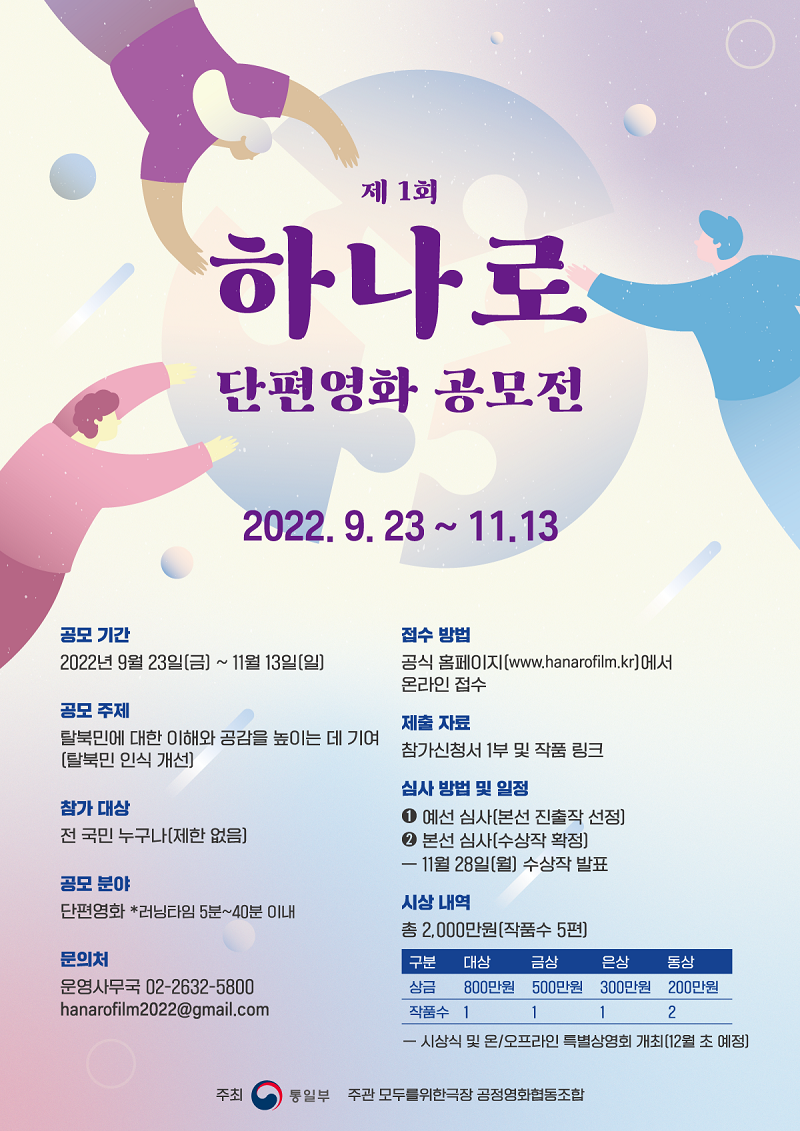 ‘하나로 단편영화 공모전’은 탈북민에 대한 긍정적 인식을 가질 수 있는 탈북민 소재 단편영화 공모전을 개최를 통해 국민들의 탈북민에 대한 이해와 공감대를 확산하며 둘째, 탈북민 소재 신규영화 창작자 및 콘텐츠를 발굴하고 영화인들의 탈북민 및 통일문제에 대한 관심 제고를 목적으로 합니다.
