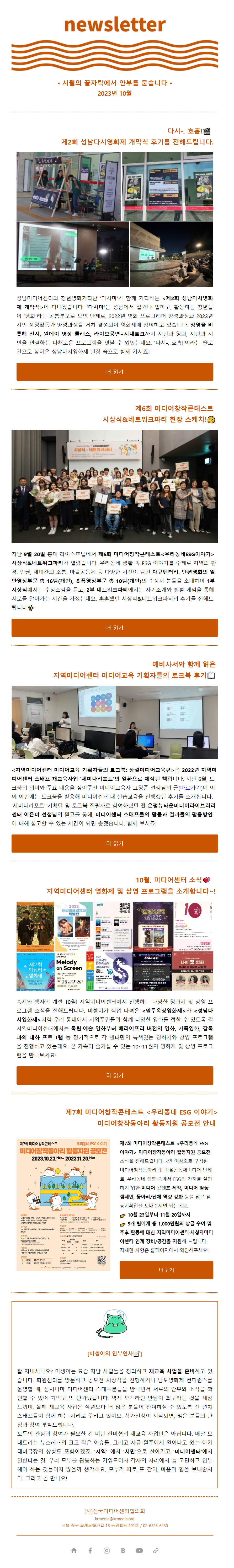 [전국미디어센터협의회] 뉴스레터 26 시월의 끝자락에서 안부를 묻습니다 (2023년 10월) 전미협2024.01.12 17:24:31 조회1193 * 본 이미지를 클릭하시면 뉴스레터 화면으로 연결됩니다 *