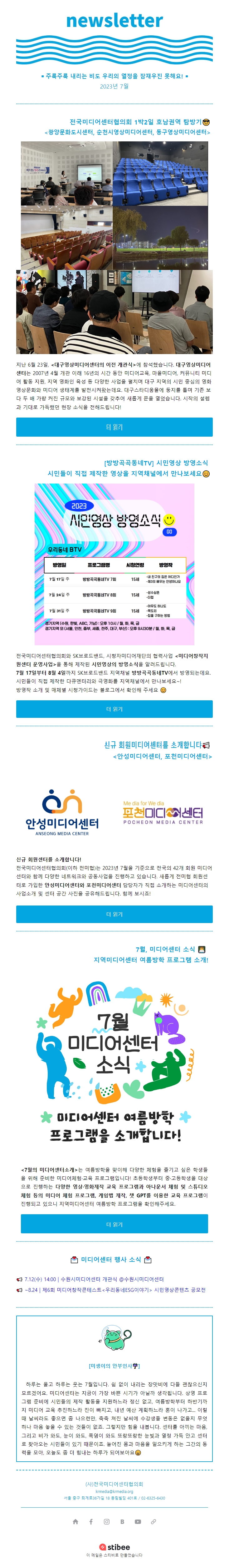 [전국미디어센터협의회] 뉴스레터 23 주룩주룩 내리는 비도 우리의 열정을 잠재우진 못해요! (2023년 7월) 전미협2024.01.12 14:31:12 조회1043 * 본 이미지를 클릭하시면 뉴스레터 화면으로 연결됩니다 *
