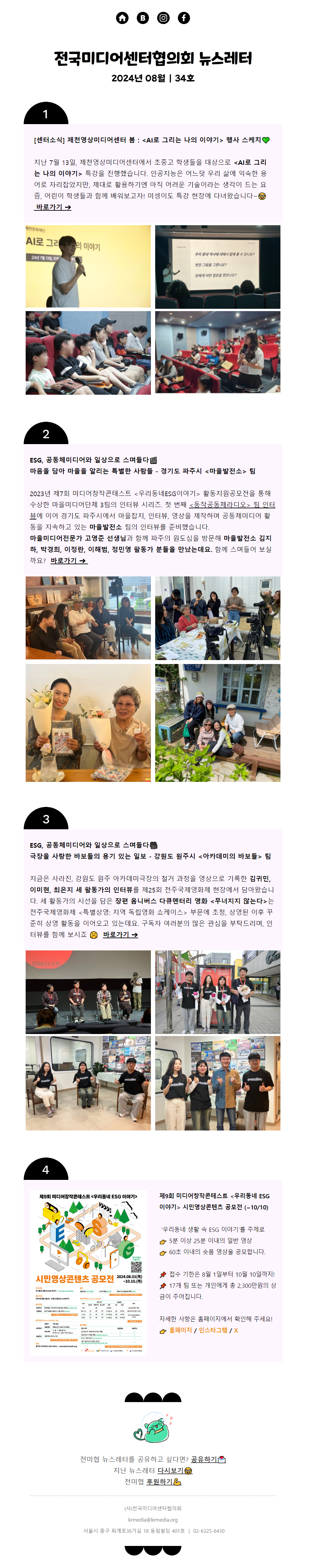 [전국미디어센터협의회] 뉴스레터 34 전미협에서 전하는 8월의 뉴스레터 (2024년 8월) 전미협2024.08.08 18:00:05 조회923 * 본 이미지를 클릭하시면 뉴스레터 화면으로 연결됩니다 *