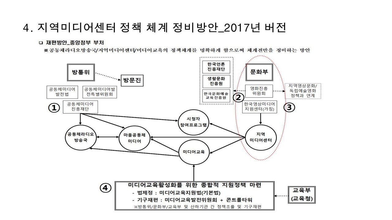 - 지역차원의 커뮤니케이션은 어떻게 이루어지고 있는가? 이것의 통합은 국가적 차원의 커뮤니케이션으로 나아간다. 정책적 차원에서는 문체부의 ‘국민소통실’ 등의 정책이 정부정책홍보 등에 필요하겠지만, 여기서 더 나아가 시민들의 참여적 미디어 활동을 어떻게 확장할 것인지까지 논의해야한다. 시민참여적 미디어활동이 왜 필요하고, 이것을 더 확대하기 위해서 어떤 노력을 해야 되는가 정리해야한다.